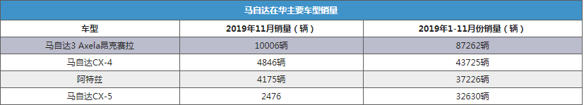 12月4日,马自达官方公布了11月份在华销售业绩(零售),数据显示,2019年11月的销量为21634辆,与去年11月的19179辆成绩相比,增长了12.8%。截止1-11月,马自达品牌累计在华销量为203258辆,与去年同期的251776辆相比下滑19.3%。