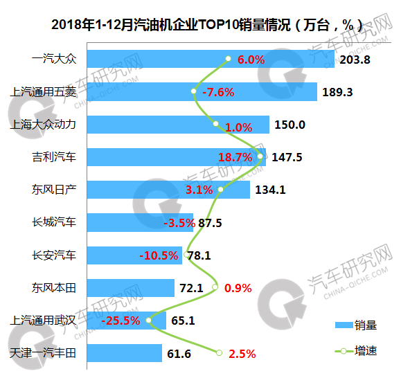 2018年汽油机企业:一汽大众销量突破200万台 吉利表现