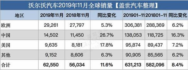 在欧洲市场,沃尔沃汽车11月比较畅销的车型有XC60、XC40和V60。欧洲市场今年1-11月的累计销量同比上涨6.2%至306,381辆。其中,在英国和德国市场的累计销量分别实现了13%和20.3%的同比增幅,并且均超过2018年的总销量。