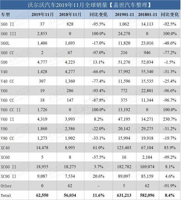 相比之下,沃尔沃汽车11月在中国市场的同比销量增幅最高,达26.7%,共售出14,502辆新车。其中,国产XC60、S90和XC40为主要销量主力。截至11月底,沃尔沃汽车今年在中国市场的累计销量为138,053辆,已经超出去年在华的总销量。此前,沃尔沃汽车亚太区采购副总裁李海在曾透露,2019年沃尔沃汽车中国市场销量预计将同比增长14%。