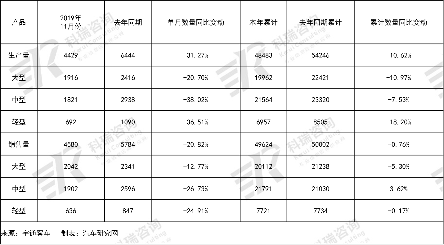 12月6日,郑州宇通客车股份有限公司发布2019年11月产销数据快报。与9月和10月相比,11月宇通客车整体销量仍是同比下滑态势,但降幅明显缩窄,且环比10月销量实现大幅正增长。其大、中、轻客车销量也均实现了环比正增长。