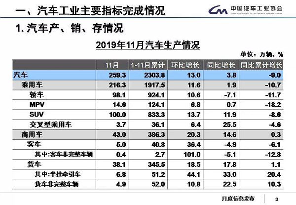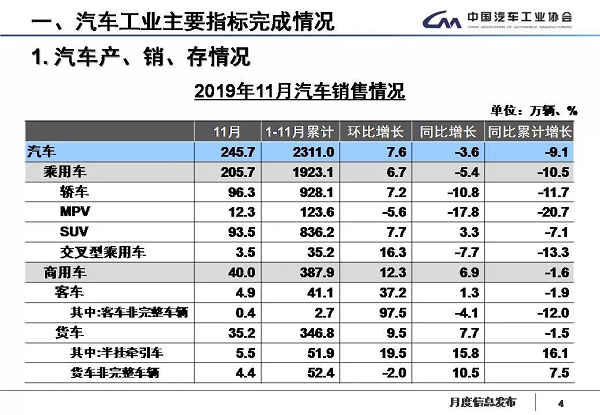 据中国汽车工业协会统计分析,2019年11月,汽车产销表现总体好于上月,其中产量增速明显高于销量,商用车表现好于乘用车。1-11月,汽车产销同比依然下降,但产销降幅比1-10月继续呈小幅收窄。