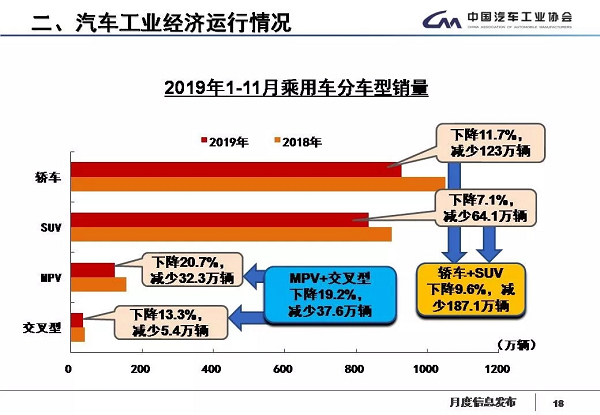 1-11月,乘用车产销分别完成1917.5万辆和1923.1万辆,产销量同比分别下降10.7%和10.5%。产销量降幅比1-10月继续收窄。乘用车四类车型产销情况看:轿车产销量同比均下降11.7%;SUV产销量同比分别下降8.6%和7.1%;MPV产销量同比分别下降18.2%和20.7%;交叉型乘用车产销量同比分别下降4.6%和13.3%。