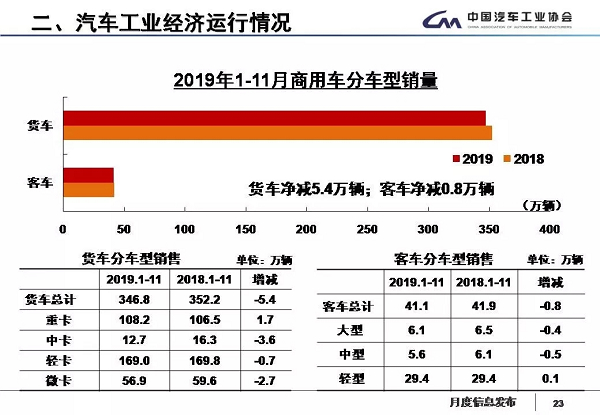 1-11月,汽车产销分别完成2303.8万辆和2311万辆,产销量同比分别下降9%和9.1%,产销量降幅比1-10月分别收窄1.4和0.6个百分点。