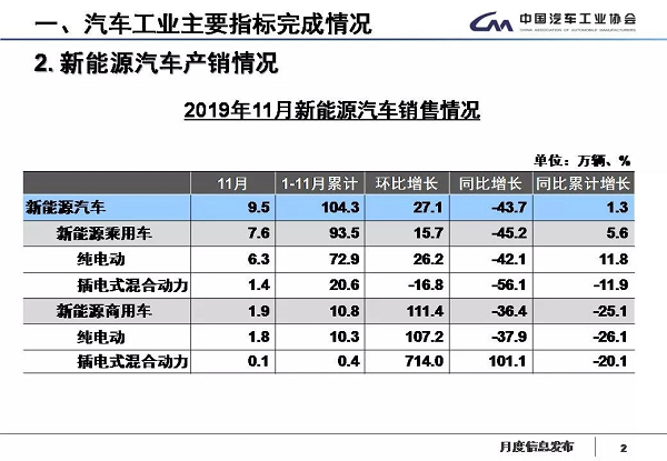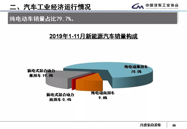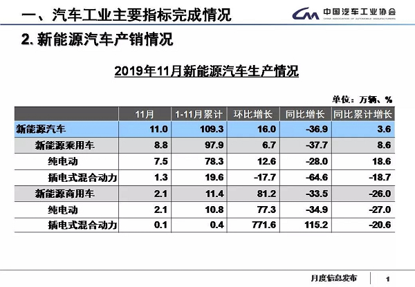 1-11月,新能源汽车产销分别完成109.3万辆和104.3万辆,同比分别增长3.6%和1.3%。其中纯电动汽车产销分别完成89.1万辆和83.2万辆,同比分别增长10.3%和5.2%;插电式混合动力汽车产销分别完成20.1万辆和21万辆,同比分别下降18.7%和12.1%;燃料电池汽车产销分别完成1426辆和1337辆,同比分别增长398.6%和375.8%。