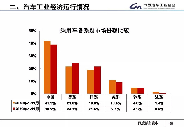 2019年11月,中国品牌乘用车共销售80.6万辆,同比下降11.4%,占乘用车销售总量的39.2%,比上年同期下降2.7个百分点;其中:中国品牌轿车销售18.6万辆,同比下降20.9%,占轿车销售总量的19.3%,比上年同期下降2.5个百分点;中国品牌SUV销售49.2万辆,同比下降5.5%,占SUV销售总量的52.6%,比上年同期下降4.9个百分点;中国品牌MPV销售9.3万辆,同比下降19.8%,占MPV销售总量的75.9%,比上年同期下降1.9个百分点。