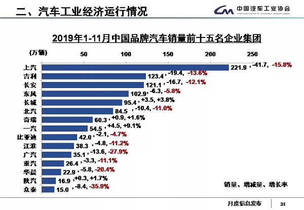 1-11月,汽车销量排名前十位的企业集团销量合计为2087.2万辆,同比下降7.8%,高于行业增速1.3个百分点。占汽车销售总量的90.3%,高于上年同期1.3个百分点。