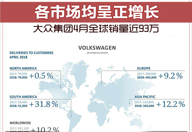 近日,大众汽车集团正式对外公布了其1-4月份全球销量,4月份大众集团向全球范围内交付新车927,200辆,相比去年同期增长10.2%。同时在全球各地区及市场的销售表现均实现正向增长,其中最高涨幅是巴西市场,实现50.4%的增长。另外,中国依然大幅领跑全球市场,贡献出总销量的三 [详细]