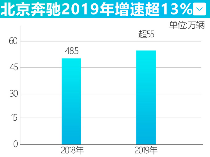 从北汽集团官方获悉,2019年北京奔驰全年销量超过55万辆,远超2018年同期48.5万辆的成绩,同比大幅增长13%以上。随着去年年底EQC、GLB