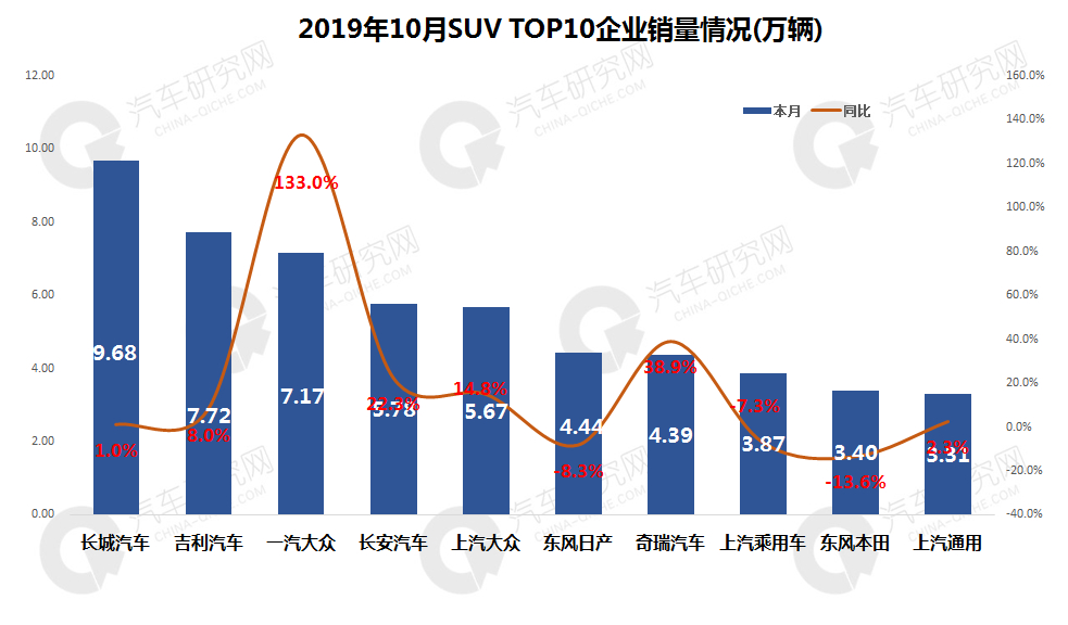 2019年10月SUV销量:长城保持领先地位 自主品牌SUV销量遥遥领先