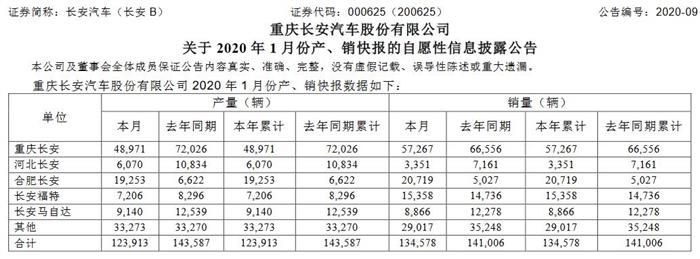 数据显示,长安汽车2020年1月销量134,578辆;长安系中国品牌汽车销量103,899辆;长安系中国品牌乘用车销量79,708辆,逆势增长1.8%。