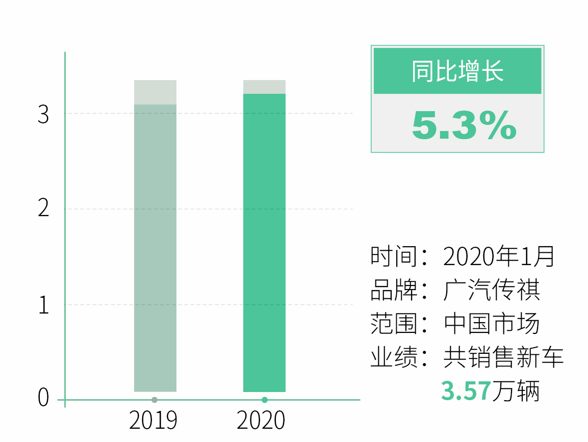 根据官方公布的信息显示,2020年1月,广汽传祺累计销量为35,688辆,与2019年1月的33,891辆相比,同比增长5.3%。此外,去年11月刚刚上市的全新一代GS4也是获得了消费者的认可,新车上市首月终端销量就已破万,1月销量也达到了1.67万辆,环比增长27.93%,三个月累计销量更是超过4万辆。