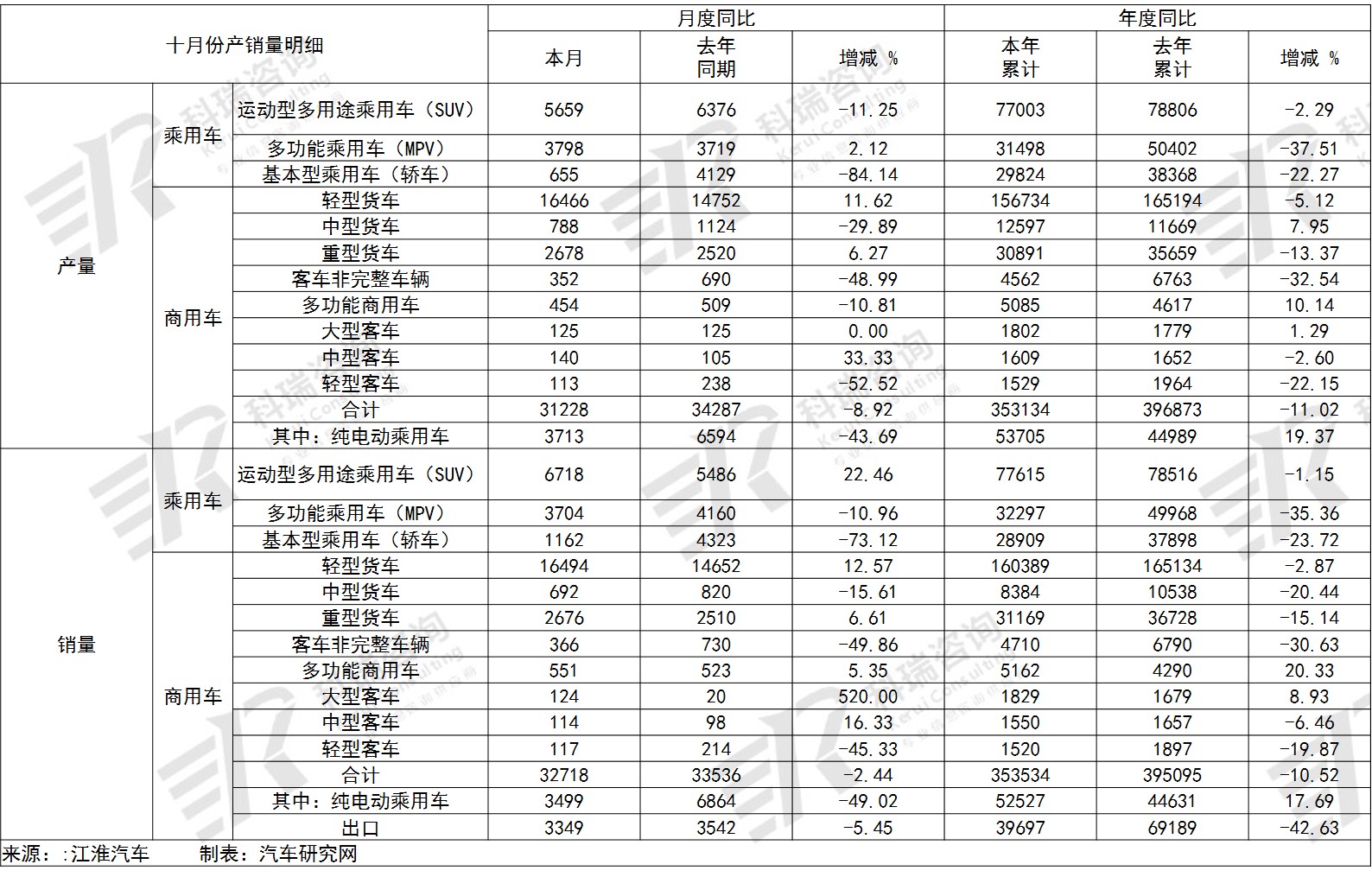 轻卡1.6万辆增13% 大客暴涨520% 江淮10月销量出炉