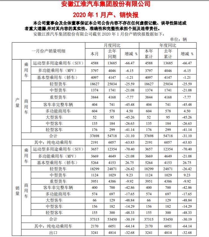 2月14日,安徽江淮汽车集团股份有限公司发布2020年1月产销快报。快报显示,江淮汽车2020年1月份销售各类汽车及底盘373315辆,同比下降30.19%;生产各类汽车及底盘37698辆,同比下降31.1%。 [详细]