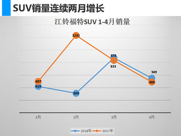 江铃汽车公布最新销量数据显示,4月份,江铃福特销量为3,631辆,同比下滑36.2%,其中SUV车型撼路者销售549辆,同比增长12.5%,商用车全顺和途睿欧销量为3,082辆,同比下降40.8%。从今年1-4月份销量来看,SUV车型销量已经连续两月增长,而MPV车型全顺和途睿欧销量仍有大幅下跌。