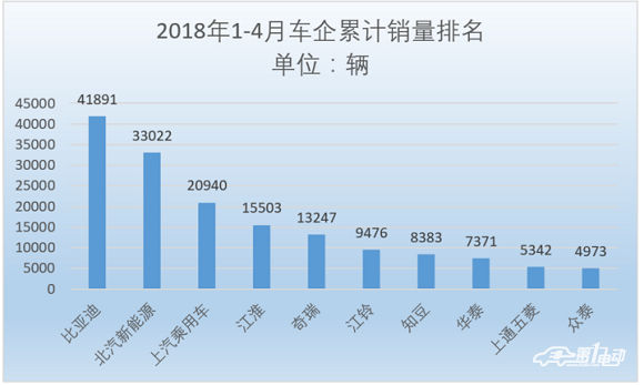 车企方面,比亚迪以4月销售13392辆排名第一,同比增速116%,1-4月累计销售41891辆,是截至目前的2018年销量榜单冠军企业;排名第二的为单月销量11771台的北汽新能源,同比增长104%;上汽则以单月销量7504台排名第三,同比增速180%,1-4月累计销量20940台。从销量榜单排名看,4月单月销量排行的前三名与2018年的累计销量排名一致。