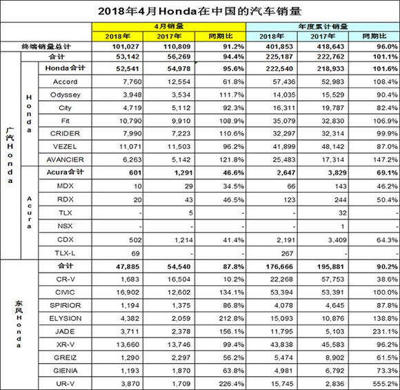 5月10日,本田发布了4月份在华终端销量数据,显示2018年4月广汽本田和东风本田累计售车101,027辆,同比下跌8.8%。其中广汽本田4月份终端销量为53,142辆,同比下降5.6%,分析原因,主力车型雅阁销量大幅下跌是主因;东风本田4月份终端销量为47,885辆,同比下滑12.2%,跌幅较上月有所收窄。