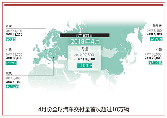 2018年5月16日,网通社从斯柯达汽车官方获悉,该品牌4月份在全球范围内共交付汽车107,100辆,与去年同期的97,300辆相比增长10.1%,同时也这是斯柯达4月份全球销量首次超过10万辆。在该品牌全球最大单一市场——中国,斯柯达4月份交付量超过28,000辆,同比增长34%。