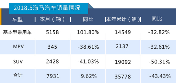 近日,汽车头条APP据海马汽车官方获悉,5月海马汽车销量共计7931辆,同比增长9.62%,累计销量35778辆,同比下滑43.43%。