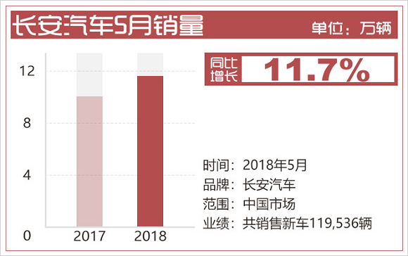 长安汽车自2017年宣布香格里拉计划后,在2018年内都在有条不紊的对旗下产品进行更新升级。网通社从长安汽车官方获悉,长安品牌汽车5月销量为119,536辆,同比增长11.7%,其中长安品牌乘用车5月销量68,190辆。