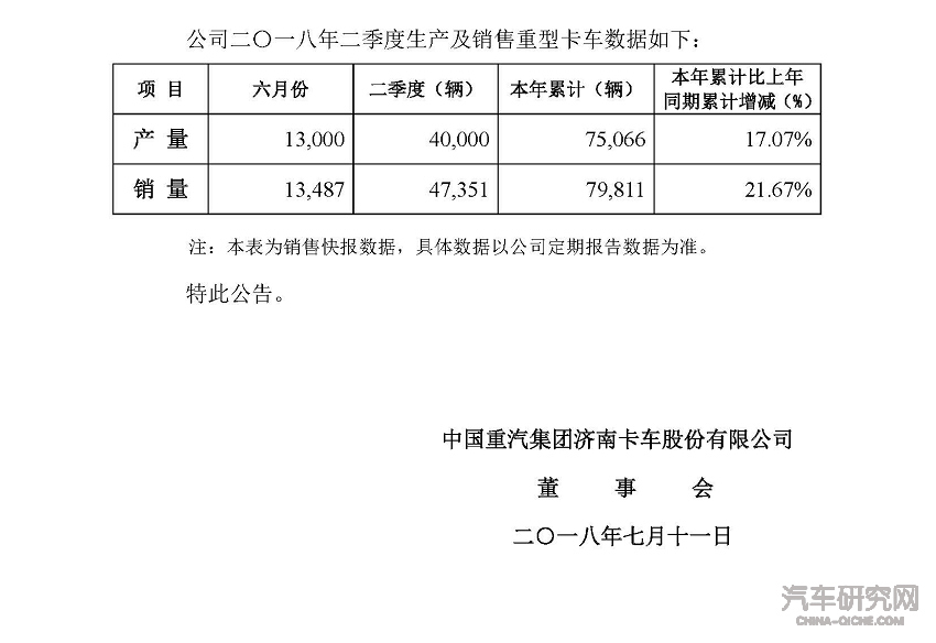 附件:中国重汽集团济南卡车股份有限公司发布2018年6月产销快报