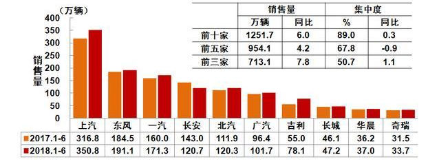 1-6月,汽车销量排名前十位的企业集团销量合计为1251.7万辆,比上年同期增长6.0%,高于行业增速0.4个百分点。占汽车销售总量的89%,比上年同期提高0.4个百分点。