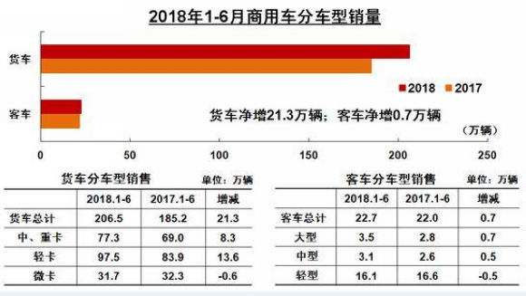 1-6月,商用车产销分别完成220.4万辆和229.1万辆,产销量比上年同期分别增长9.4%和10.6%。分车型产销情况看,客车产销分别完成23万辆和22.7万辆,比上年同期分别增长5.2%和2.8%;货车产销分别完成197.4万辆和206.5万辆,产销量比上年同期分别增长9.9%和11.5%,其中半挂牵引车产销比上年同期分别下降20.8%和17.2%。