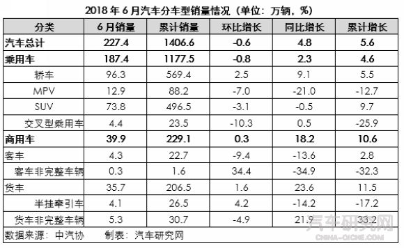 1-6月,乘用车产销分别完成1185.4万辆和1177.5万辆,产销量比上年同期分别增长3.2%和4.6%。乘用车四类车型产销情况看,轿车产量比上年同期分别增长3%和5.5%;SUV产销比上年同期分别增长9.6%和9.7%;MPV产销比上年同期分别下降17.1%和12.7%;交叉型乘用车产销比上年同期分别下降23.8%和25.9%。
