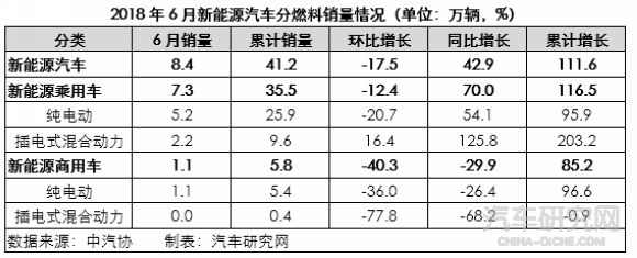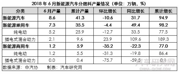 6月,新能源汽车产销分别完成8.6万辆和8.4万辆,比上年同期分别增长31.7%和42.9%。其中纯电动汽车产销分别完成6.4万辆和6.2万辆,比上年同期分别增长18.6%和29.5%;插电式混合动力汽车产销均完成2.2万辆,比上年同期分别增长93.8%和102.0%。