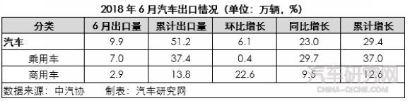 1-6月,汽车企业出口51.2万辆,比上年同期增长29.4%。分车型看,乘用车出口37.4万辆,比上年同期增长37%;商用车出口13.8万辆,比上年同期增长12.6%。