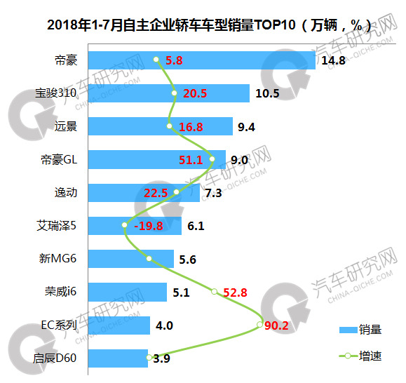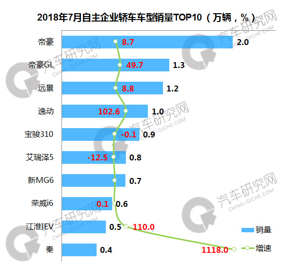 7月自主轿车销量前十车型中,吉利帝豪系列包揽前两位,其中帝豪单月销售2.0万辆,同比微增8.7%。主要车型中,本月仅上汽通用宝骏310和奇瑞艾瑞泽5销量出现下滑,其余车型均实现不同程度增长。