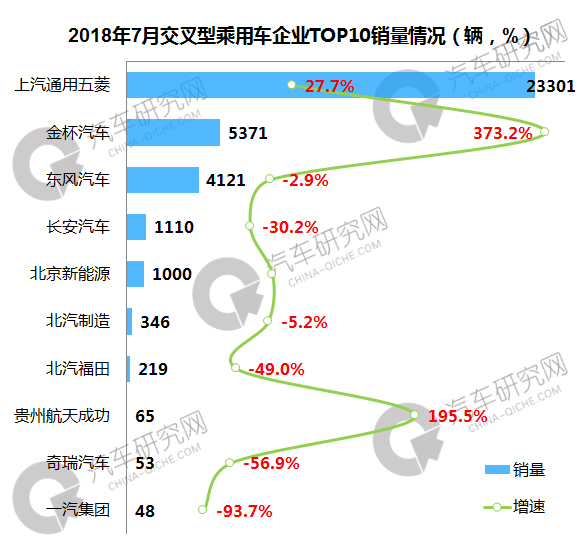 7月交叉型乘用车企业中,上汽通用五菱位居第一,共计销售23301辆,同比增长27.7%;前十企业中,金杯汽车和贵州航天成功增幅较大,分别为373.2%和195.5%,仅三家企业实现正增长,其他企业均出现下滑。