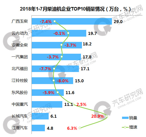 7月份柴油机企业中,广西玉柴位居第一,销量达到2.7万台,同比下滑19.7%;北汽福田位居第二,销量达到2.1万台,同比下滑15.1%;前十企业中,上海柴油股份增幅最高,达到112.3%。