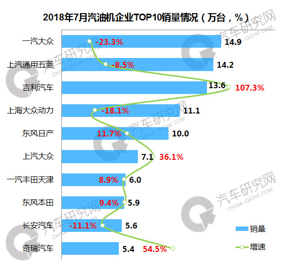 7月份汽油机企业中,一汽大众位居第一,销量达到14.9万台,同比下滑23.3%;上汽通用五菱紧随其后,销量达到14.2万台,同比下滑8.5%;前十企业中,吉利汽车增幅最高,达到107.3%。