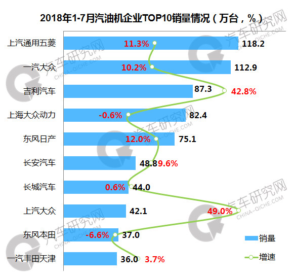 1-7月汽油机企业中,上汽通用五菱位居第一,销量达到118.2万台,同比增长11.3%;一汽大众位居第二,累计销量达到112.9万台,同比增长10.2%;前十企业中,上汽大众动力增幅最高,同比增长49.0%。
