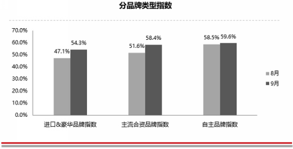 从分品牌类型指数看: 9月进口&豪华品牌指数、合资品牌指数、自主品牌指数较上月上升。