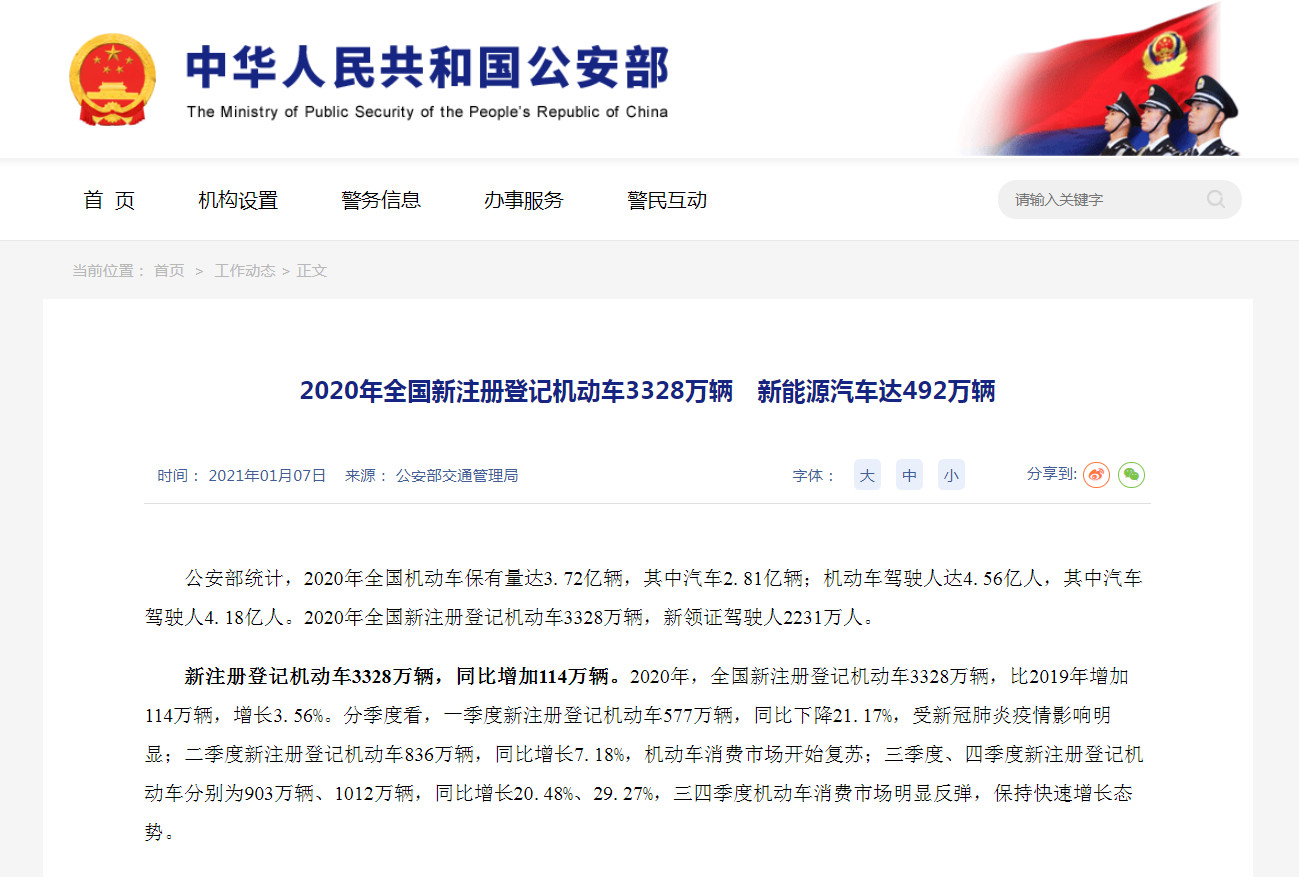 2020年全国新注册登记机动车3328万辆 新能源汽车达492万辆