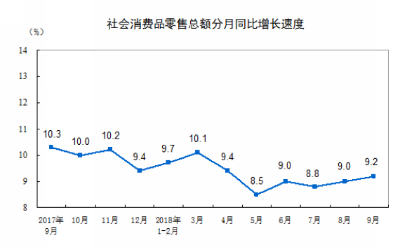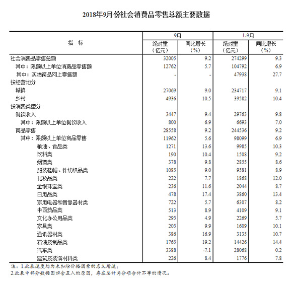 2018年1-9月份,社会消费品零售总额274299亿元,同比增长9.3%。其中,限额以上单位消费品零售额104792亿元,增长6.9%。