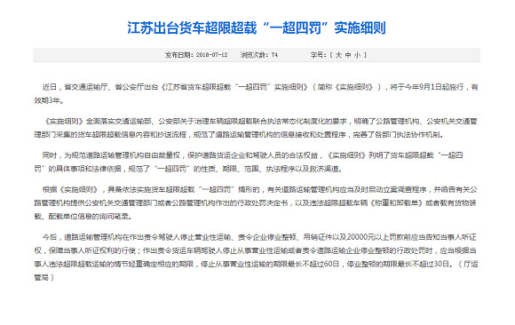 中国卡车网获悉,江苏省交通运输厅、省公安厅出台《江苏省货车超限超载“一超四罚”实施细则》,于2018年年9月1日起施行,有效期3年。