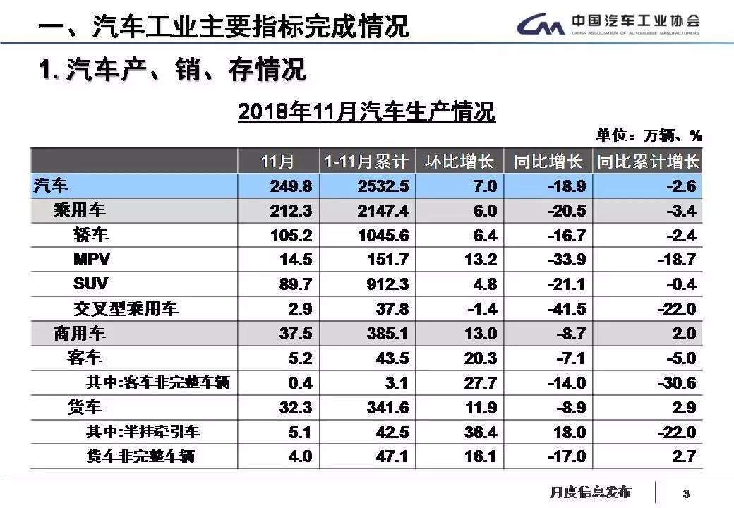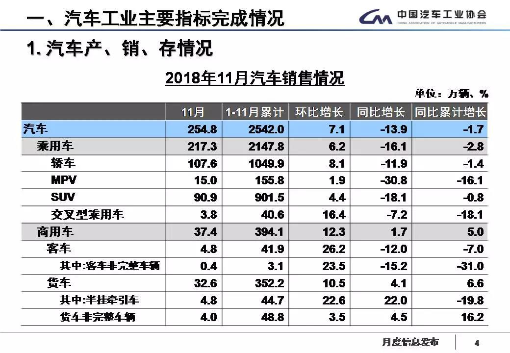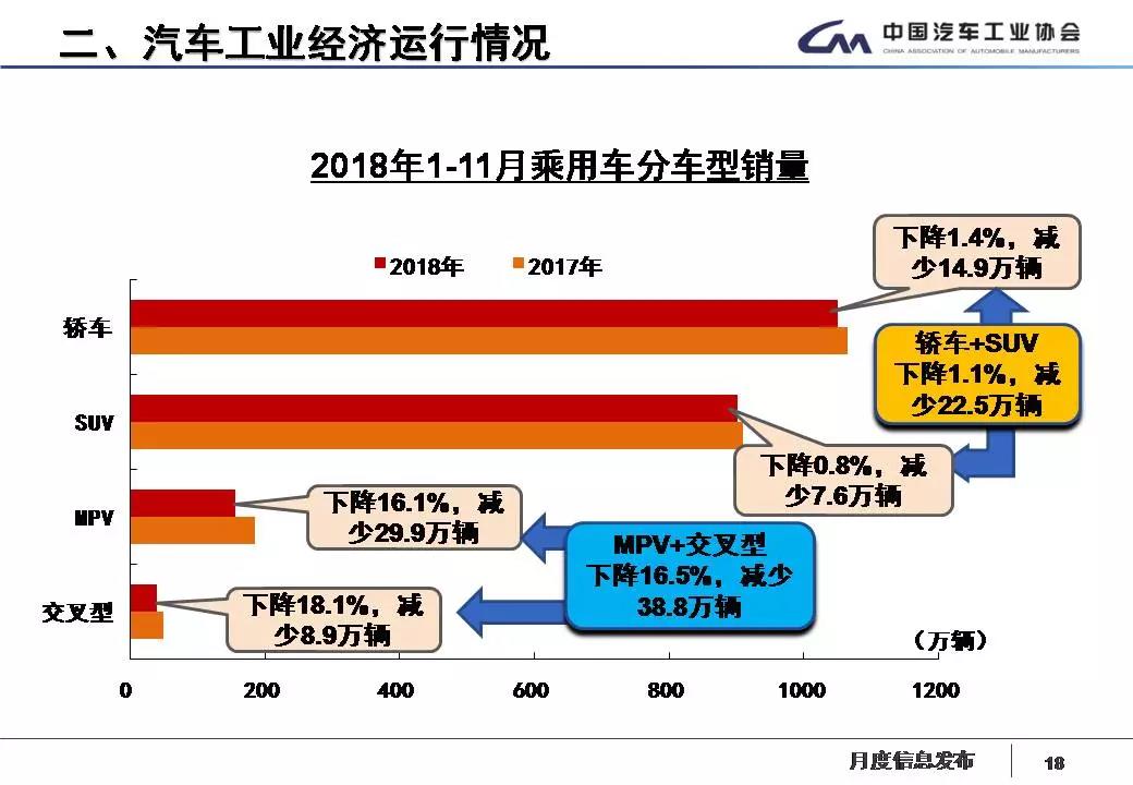 1-11月,乘用车产销分别完成2147.4万辆和2147.8万辆,产销量比上年同期分别下降3.4%和2.8%。乘用车四类车型产销情况看,轿车产销量比上年同期分别下降2.4%和1.4%;SUV产销首次呈现下降,分别下降0.4%和0.8%;MPV产销比上年同期分别下降18.7%和16.1%;交叉型乘用车产销比上年同期分别下降22%和18.1%。