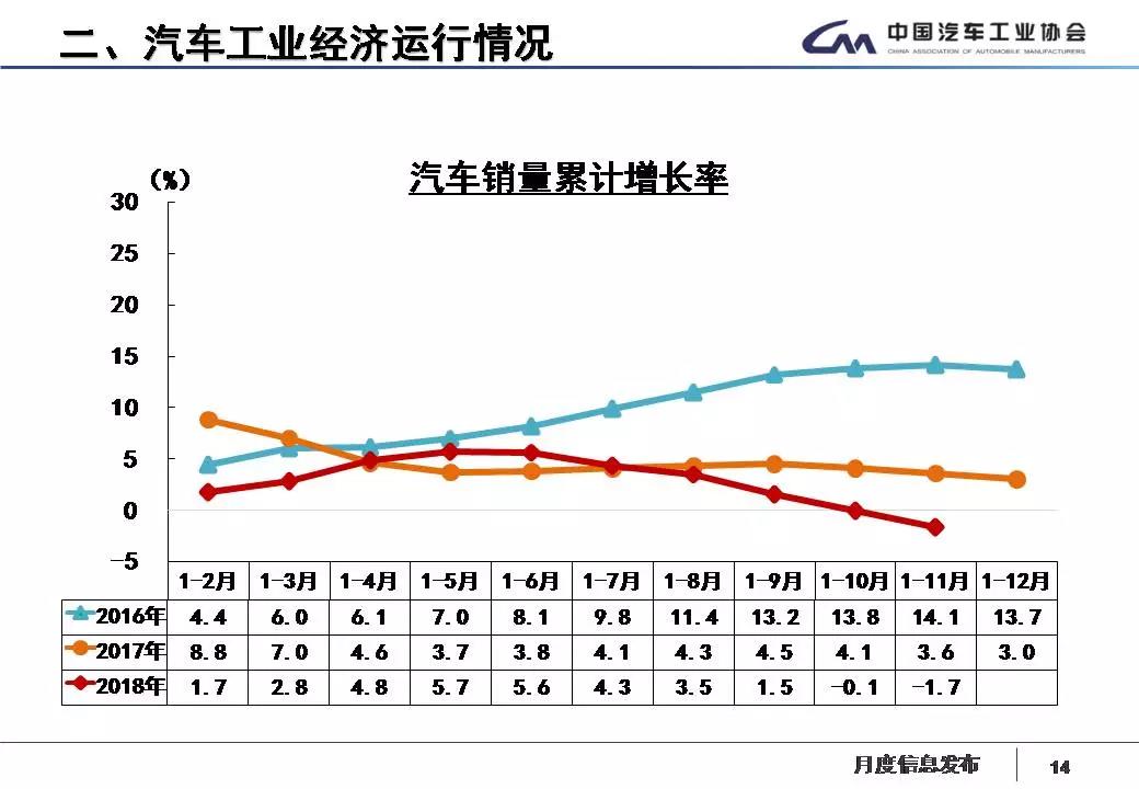 1-11月,汽车产销分别完成2532.5万辆和2542万辆,产销量比上年同期分别下降2.6%和1.7%。产销量增速继续回落。