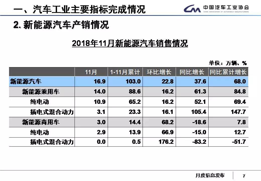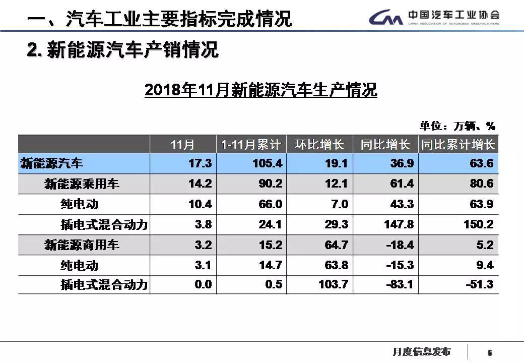 11月,新能源汽车产销分别完成17.3万辆和16.9万辆,比上年同期分别增长36.9%和37.6%。其中纯电动汽车产销分别完成13.5万辆和13.8万辆,比上年同期分别增长23.6%和30.3%;插电式混合动力汽车产销分别完成3.8万辆和3.1万辆,比上年同期分别增长121.7%和82.5%。