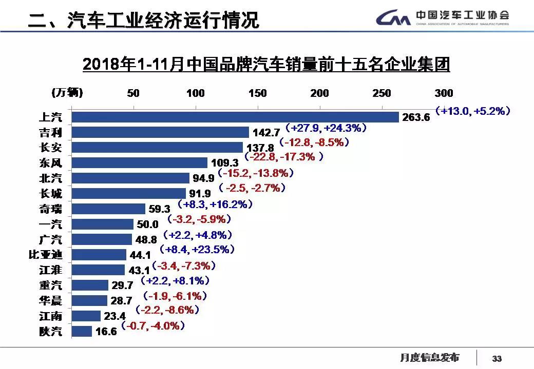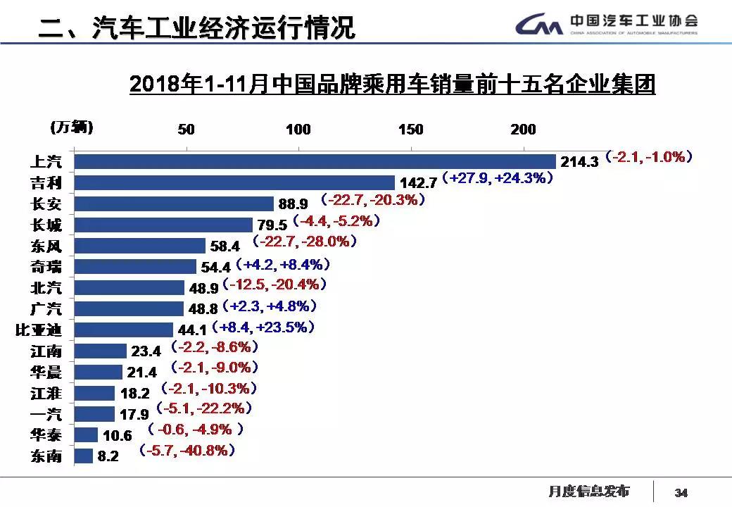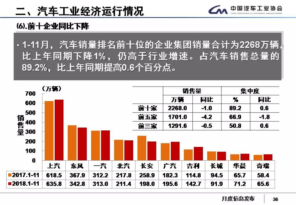 1-11月,汽车销量排名前十位的企业集团销量合计为2268万辆,比上年同期下降1%,仍高于行业增速。占汽车销售总量的89.2%,比上年同期提高0.6个百分点。