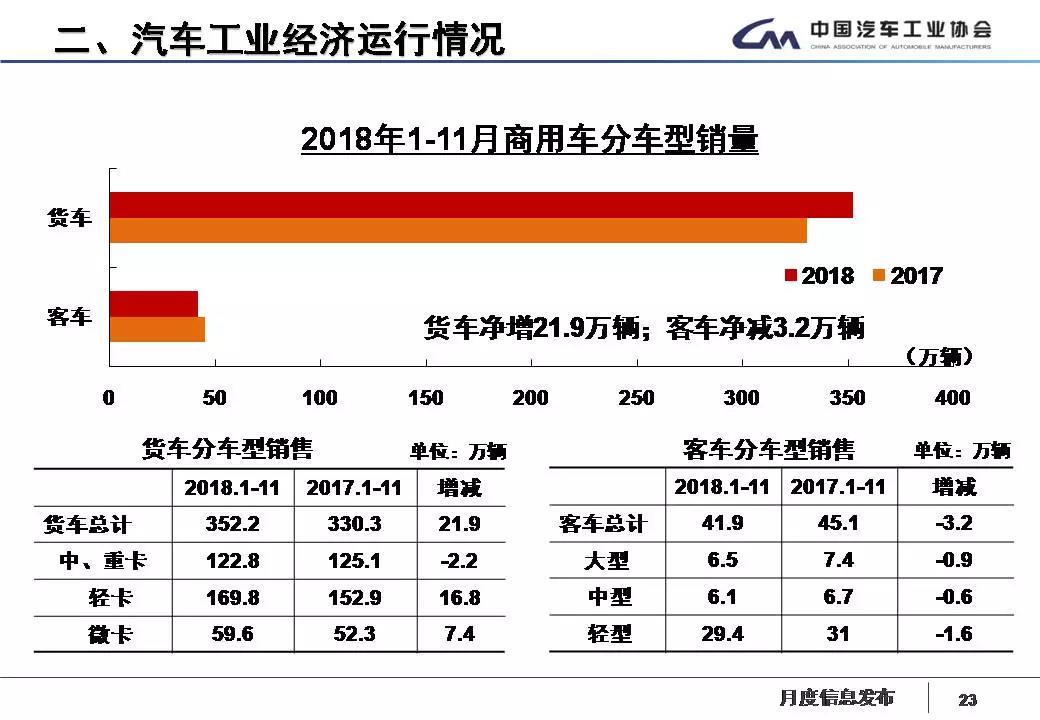 1-11月,商用车产销分别完成385.1万辆和394.1万辆,产销量比上年同期分别增长2%和5%。分车型产销情况看,客车产销分别完成43.5万辆和41.9万辆,产销量比上年同期分别下降5%和7%;货车产销分别完成341.6万辆和352.2万辆,产销量比上年同期分别增长2.9%和6.6%,其中半挂牵引车产销比上年同期分别下降22%和19.8%。