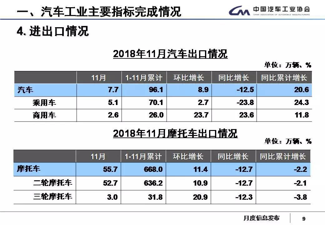 1-11月,汽车企业出口96.1万辆,比上年同期增长20.6%。分车型看,乘用车出口70.1万辆,比上年同期增长24.3%;商用车出口26万辆,比上年同期增长11.8%。