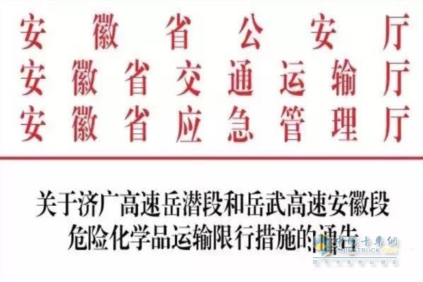 安徽省公安厅、安徽省交通运输厅和安徽省应急管理厅联合发布通告“关于济广高速岳潜段和岳武高速安徽段危险化学品运输限行措施的通告”以上两路段全天禁止行驶危险化学品运输车。