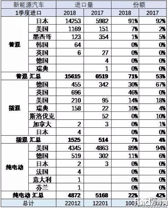 中国新能源车的进口很有特色,普通混合动力主要从日本进口,2018年的日本进口普混的占比达到91%,比17年没有下降。