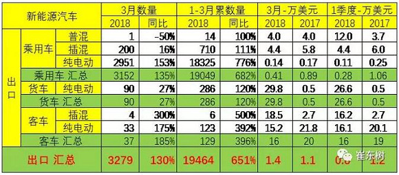 由于超微型电动车的出口增长较快,因此,18年1-3月份,出口新能源车达到19450台,同比增长650%。其中1月份出口数量达到7560台,2月出口达到8414台,3月出口3279台。1-2月均呈现超强增长的特征,这其中95%以上都是纯电动的微型乘用车。