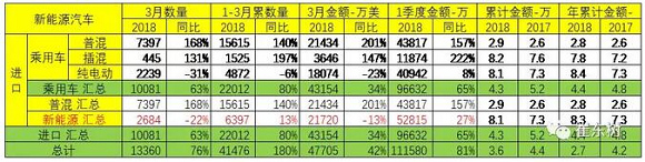 从进口结构来看,2018年1到3月份,进口的纯电动乘用车达到4872台,因为增长-6%,而插电混动,进口达到1525台,同比增长197%,插电混合动力乘用车的进口表现相对突出。