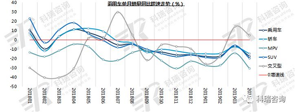 4月份乘用车市场再次下滑,不仅受中美贸易摩擦、人民币升值等宏观环境影响,还受到购房挤压购车消费、车市形成分化格局等因素的影响;细分市场中,除交叉型外其余车型均为负增长,交叉型以其多功能性及优惠的价格,连续两个月处于正增长状态,但同比出现下滑;MPV作为本就不受大众市场青睐的车型,下滑最为明显;最受大众欢迎的两种车型轿车及SUV也出现下滑,轿车下滑较为缓慢,而价格更高的SUV下滑较为明显。